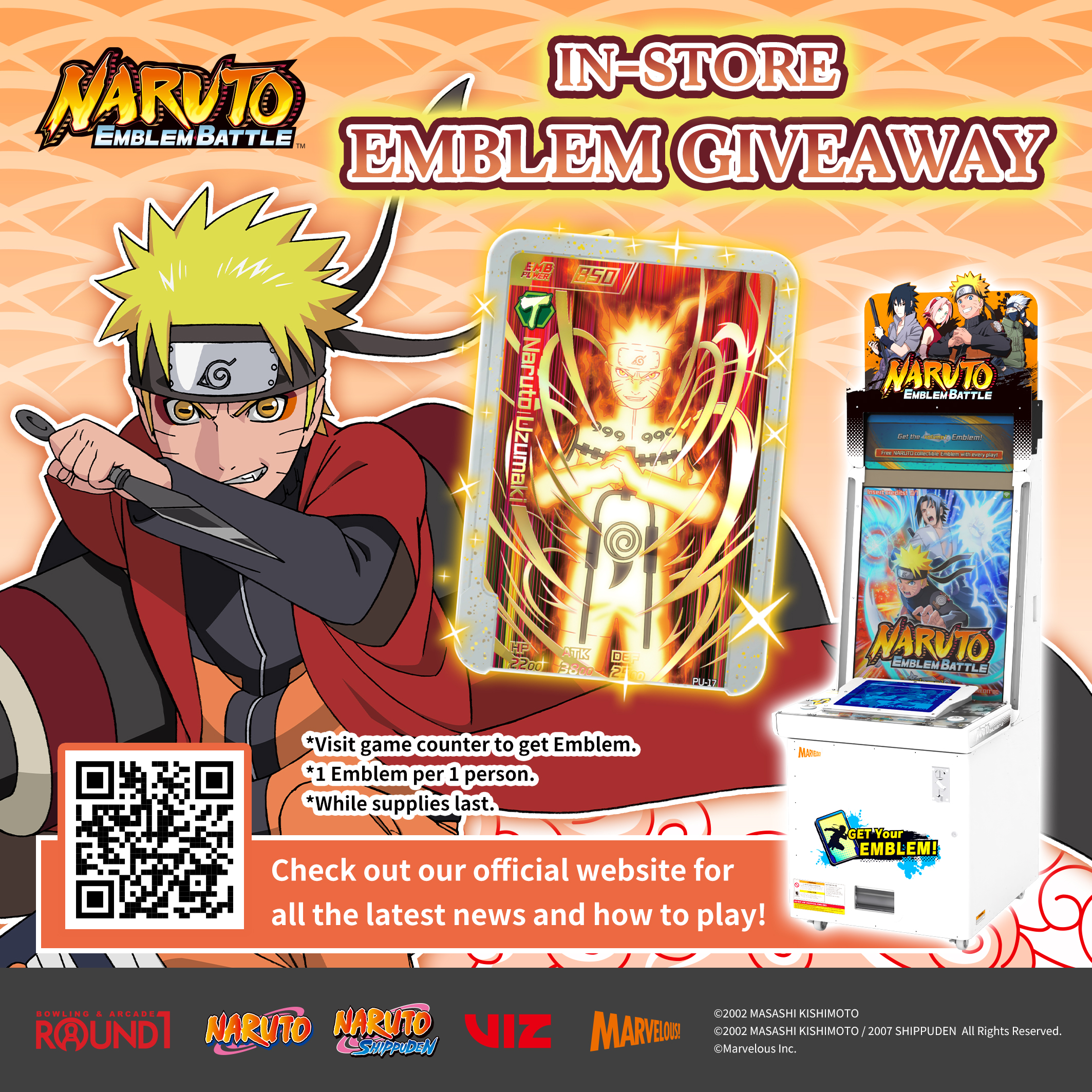 Starting December 25, you can visit your local Round1 location to receive a special 4-star Naruto Uzumaki emblem for use with NARUTO Emblem Battle. You can only get one per person, but these emblems are totally free for anyone who visits Round1 and asks for it at the counter. That said, these emblems are only available while supplies last. There’s not an end date to this promotion, but once a given location is out of them, they’re gone.