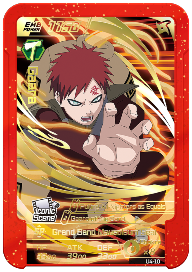 Usable on Round 1. Grants 1 chakra to each "Gaara," "Jinchuriki," and "Tailed Beast" on your team and permanently increases ATK by 1000.