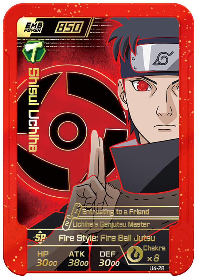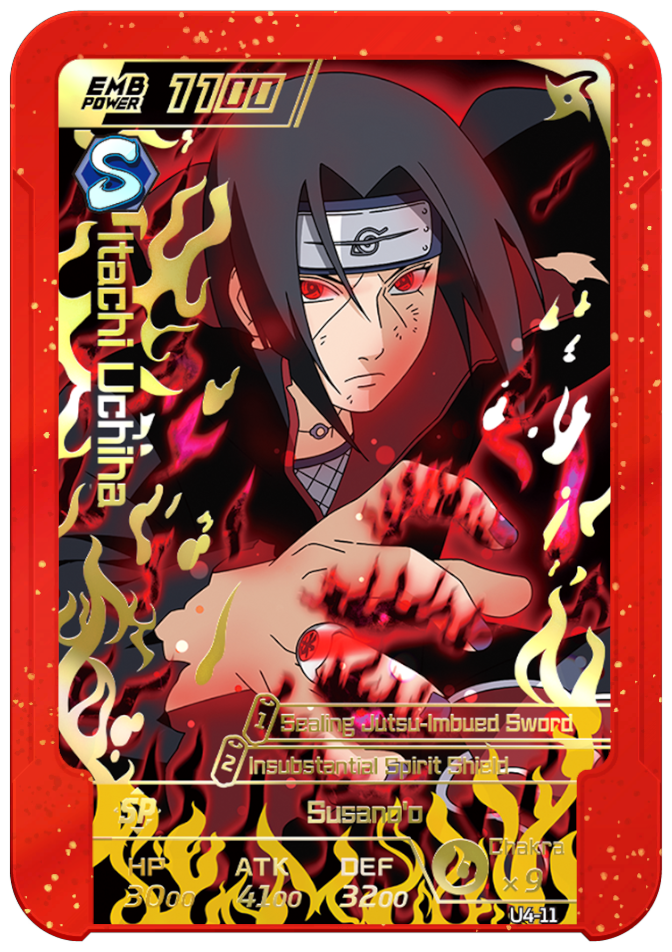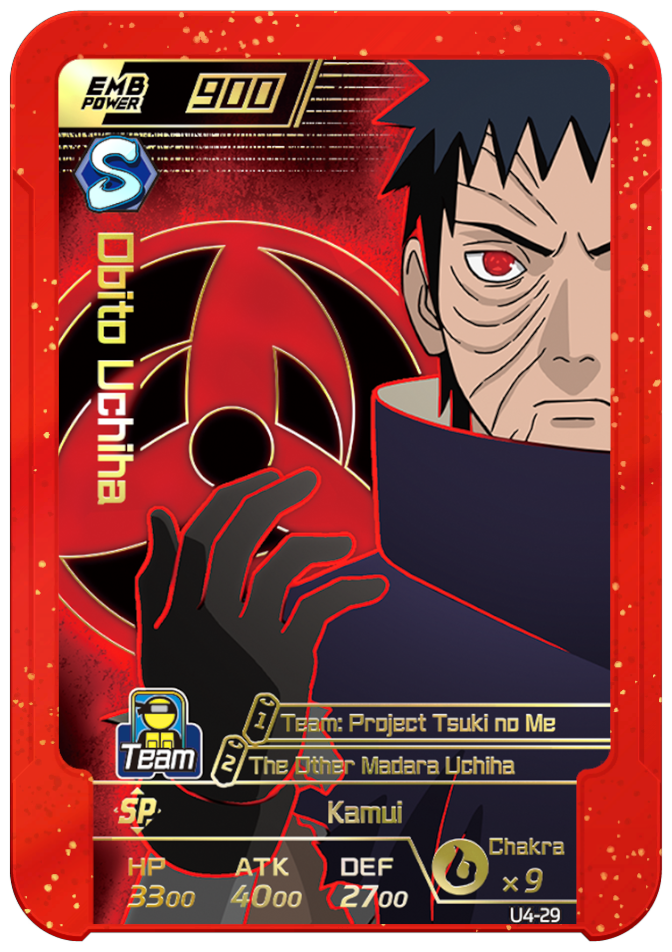 Can be used only once. When deployed as the AE, permanently decreases to each "Sharingan" on enemy team's ATK and DEF by 1000.