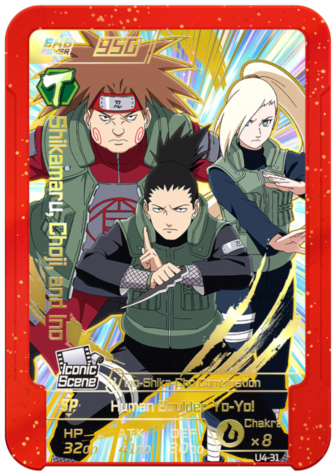 Usable on Round 3. Increases your team's ATK and DEF by 1000 until the end of the round. Grants 1 chakra to each "Shikamaru," "Choji," and "Ino" on your team and permanently increases ATK and DEF by 1500.
