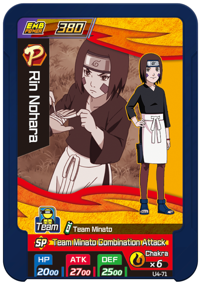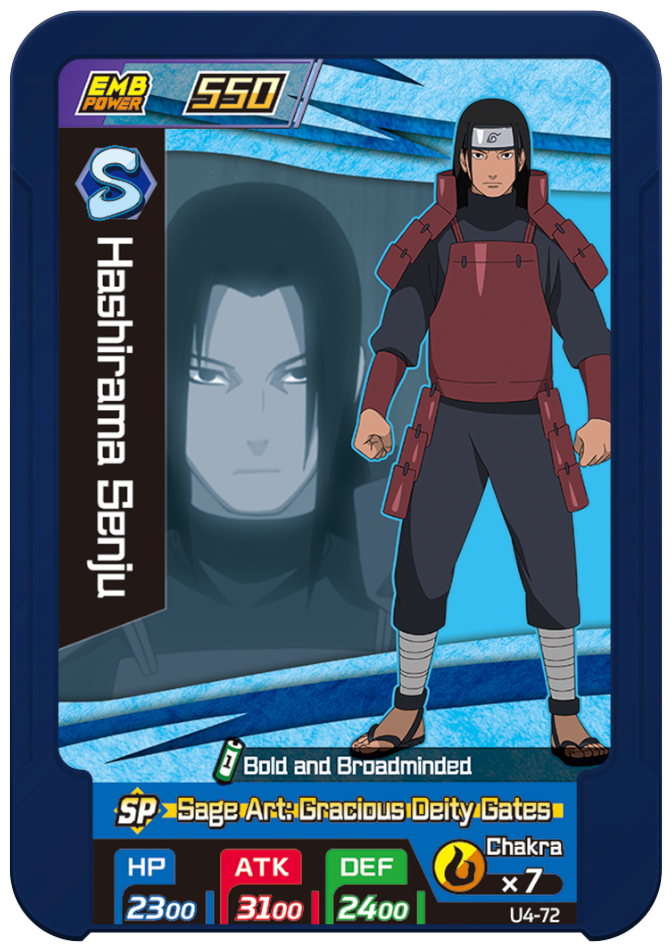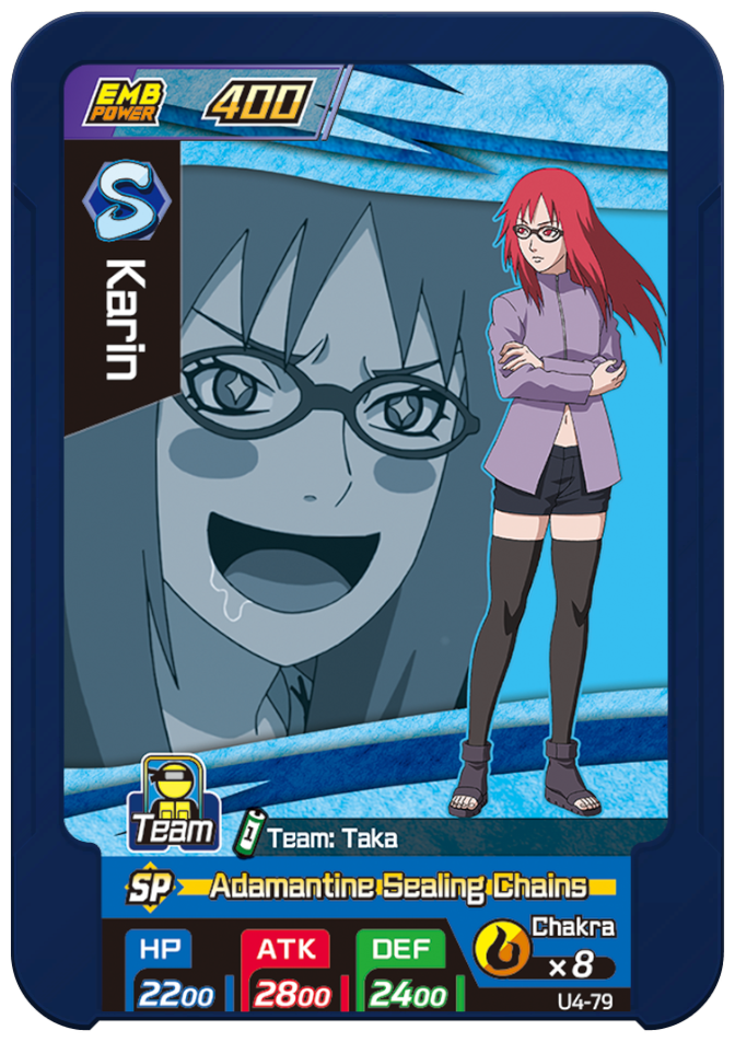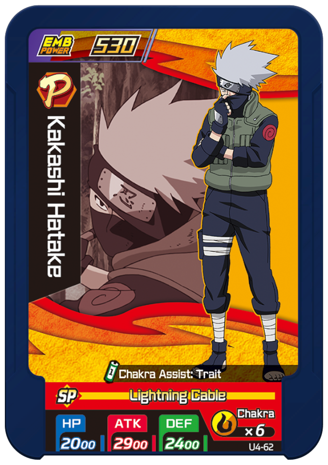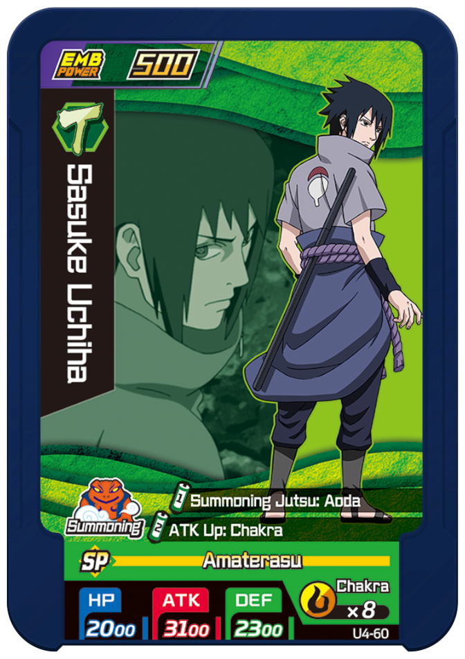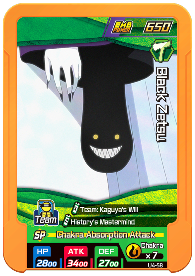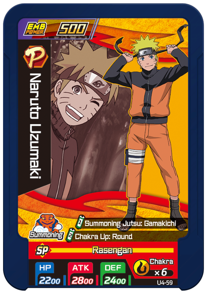 At the start of Round 4, if you have more than 5 chakra, increases your ATK by 1500 until the end of the round. If fewer than 6, grants 3 chakra.