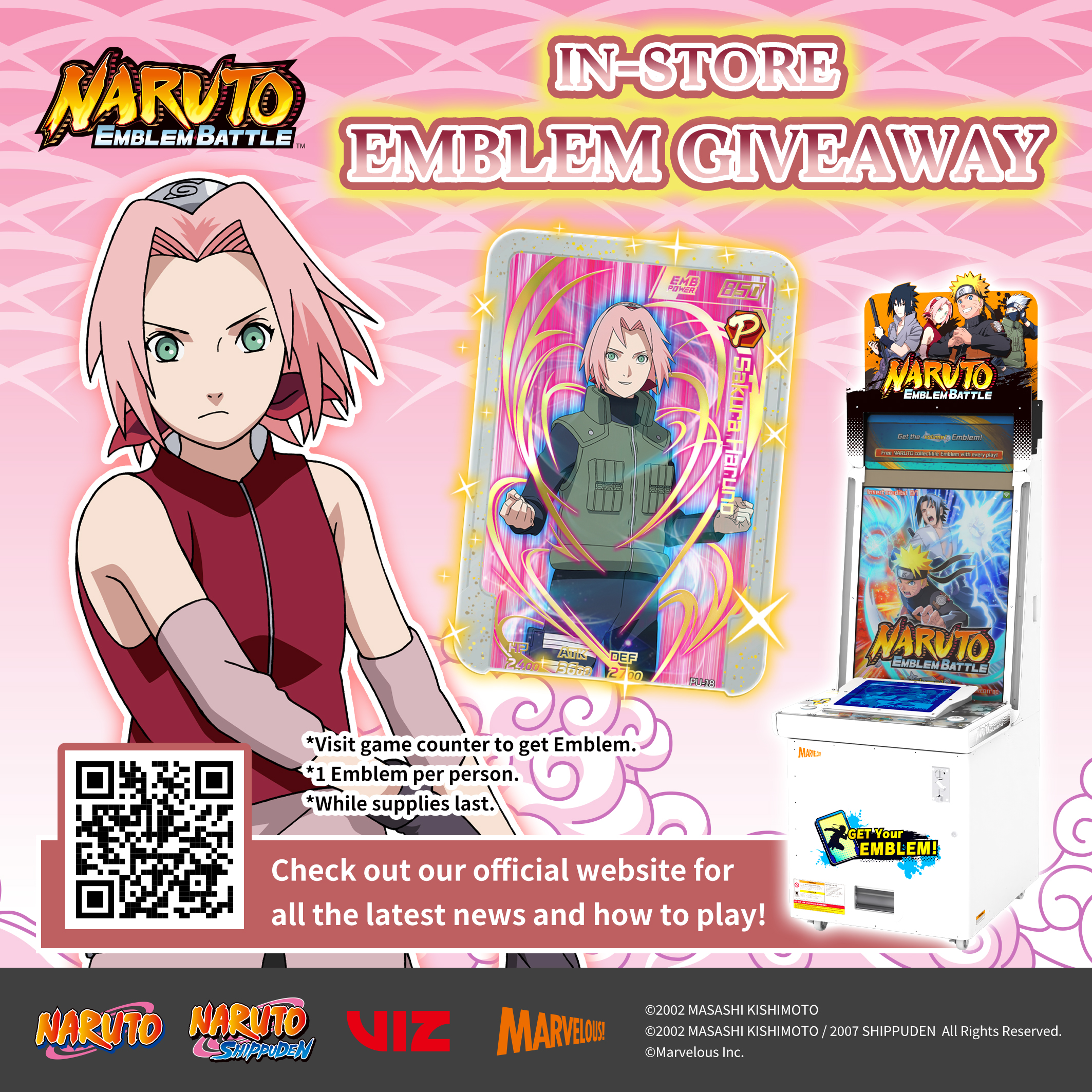 Starting on April 29, we’ll be partnering with GENDA Americas arcades, like Kiddleton and NEN, for an exclusive NARUTO Emblem Battle giveaway. All you have to do is visit participating arcades (listed below), for your chance to snag a 4-star Sakura Haruno emblem for free!