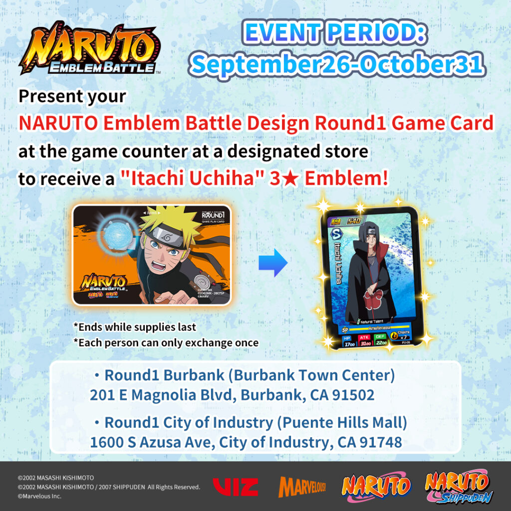 On top of getting to play all weekend long, from Sept. 26 to Oct. 31, you can bring that limited game card to participating locations in the greater Los Angeles area to redeem it for a special “Itachi Uchiha” three-star emblem. You can check out the special card and emblem below.