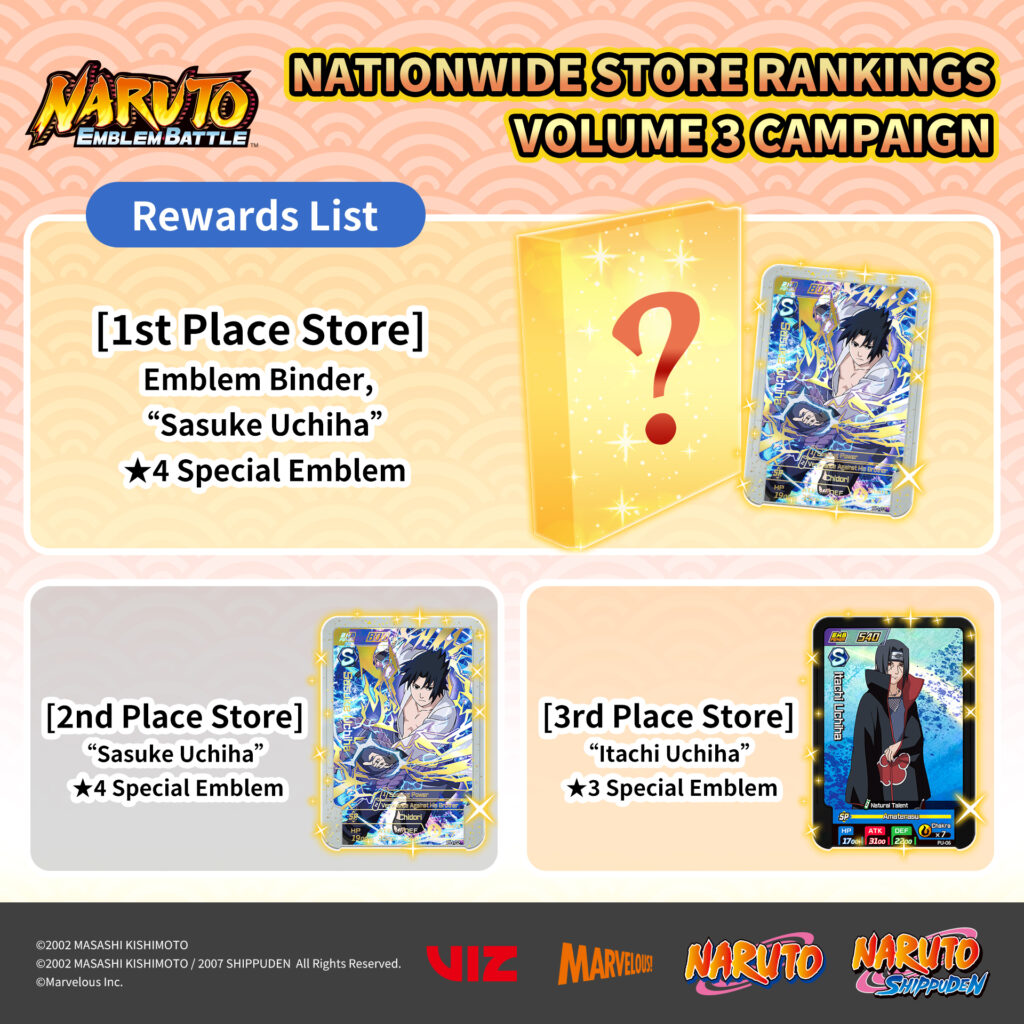 That’s not all however, as the Nationwide Store Ranking competition returns for another round, too! The Volume 3 campaign will run through November 30, with winners announced on December 3. Prizes this time are leveling up, too, as the winning location will receive an Emblem Binder and a 4-star Sasuke Uchiha Emblem. The second-place location will earn a 4-star Sasuke Uchiha Emblem, with the third-place location earning a 3-star Itachi Uchiha Emblem. You can see more details in the images below.
