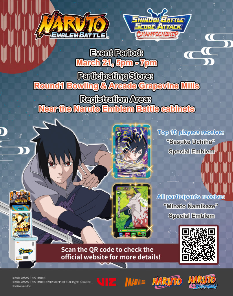 On March 21, NARUTO Emblem Battle fans in Grapevine, TX will be able to put their skills to the test in Shinobi Battle Score Attack in person! From 5PM-7PM on March 21, you can visit the Round1 Bowling & Arcade Grapevine Mills location to challenge yourself to set the highest score in this action-packed gameplay mode.