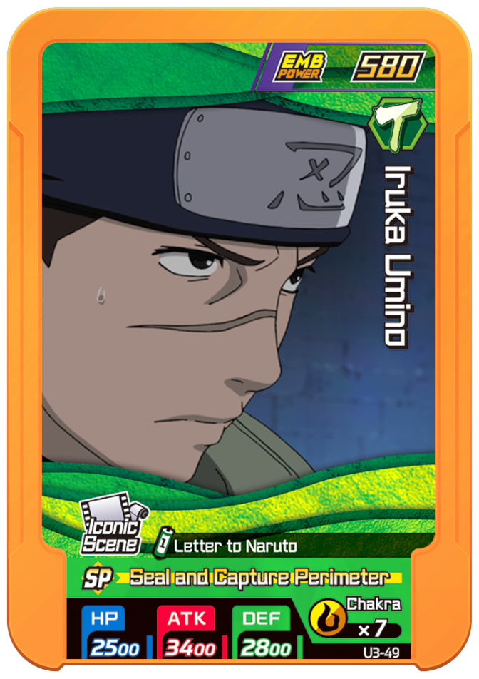 At the end of Round 2, if "Iruka" is an ally, grants 2 chakra to each "Jinchuriki" on your team.